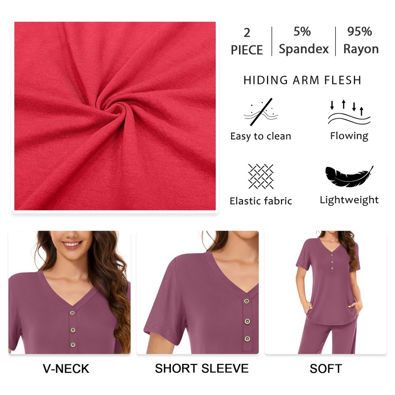 - Fashion & Comfy Design: Cute two piece outfits, short sleeve tops, soft nightwear, button down henley neckline design makes pj more stylish. Elastic waistband sleepwear pants, casual and comfy, graceful and easeful. Two side pockets hold your belongings. This 2 piece pj sets nightwear sleepwear is perfect for juniors, ladies and teens.