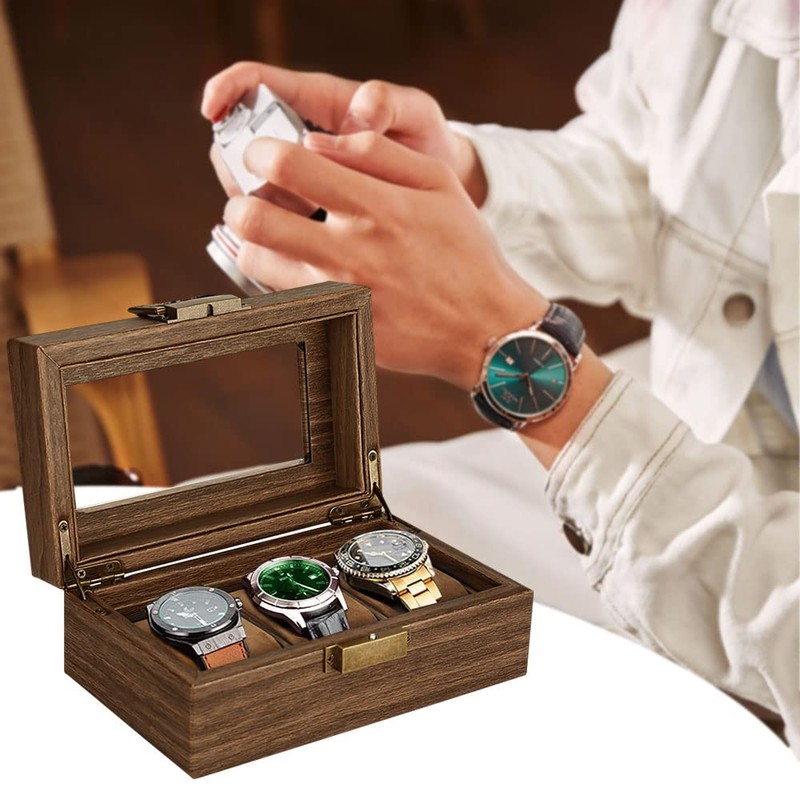 Anyasun Watch Box for Men-3 Slots Watch Organizer Case,PU Leather Watch Display Storage Box with Glass Lid(Brown, 3Slot)