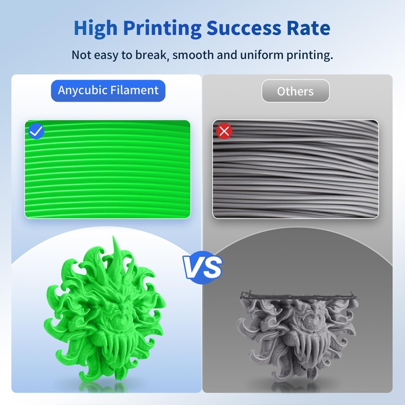 - 【𝐀𝐜𝐜𝐮𝐫𝐚𝐜𝐲 & 𝐂𝐨𝐧𝐬𝐢𝐬𝐭𝐞𝐧𝐜𝐲】 Anycubic 3D Printer PLA filament of 1.75mm diameter, Minimum dimensional tolerance +/- 0.02mm, which makes filament outflow smoother, came out homogeneous. The low shrinkage and stable printing dimensions make the fusion between the layers very good to obtain an even better-bridging result. You don't worry the diameter changes a lot then the feed rate is disrupted with thicker and thinner layers at all.