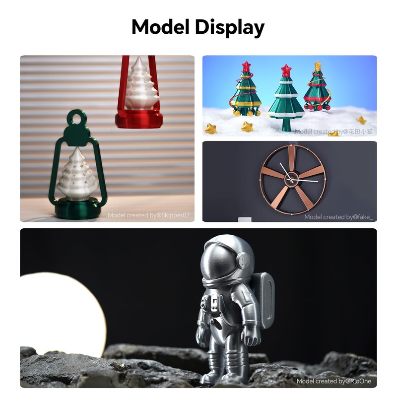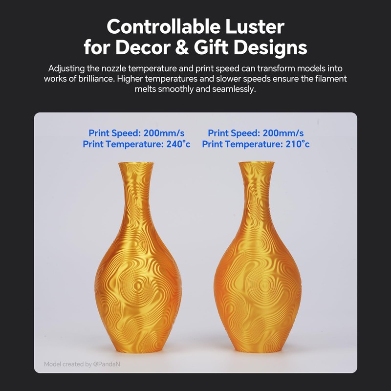 - Controllable Luster for Decor & Gift Designs: By adjusting the nozzle temperature and print speed. You can transform your models into works of brilliance. Higher temperatures and slower speeds ensure the filament melts smoothly and seamlessly.