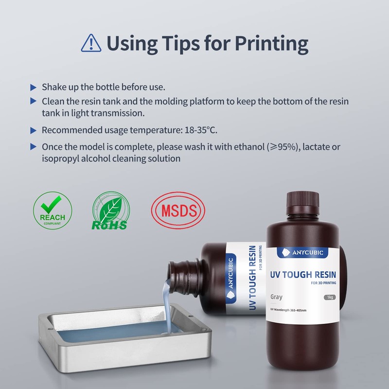ANYCUBIC Tough Resin, 3D Printer Resin with High Precision and High Toughness, 365-405nm Fast Curing 3D Resin for 4K 8K LCD/DLP/SLA 3D Printing (Grey, 1kg)