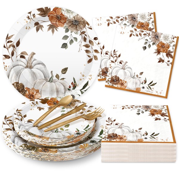 AnyDesign 150Pcs Fall Party Supplies Kit Pumpkin Floral Paper Plates Napkins Plastic Knives Forks Spoons for Autumn Thanksgiving Party Tableware, Serves 25