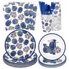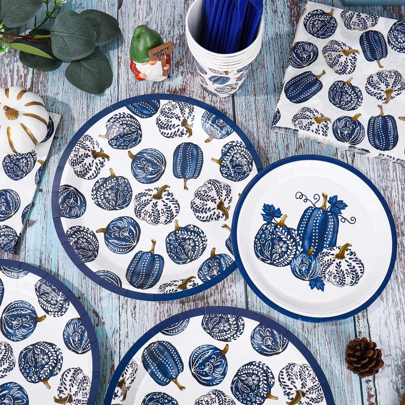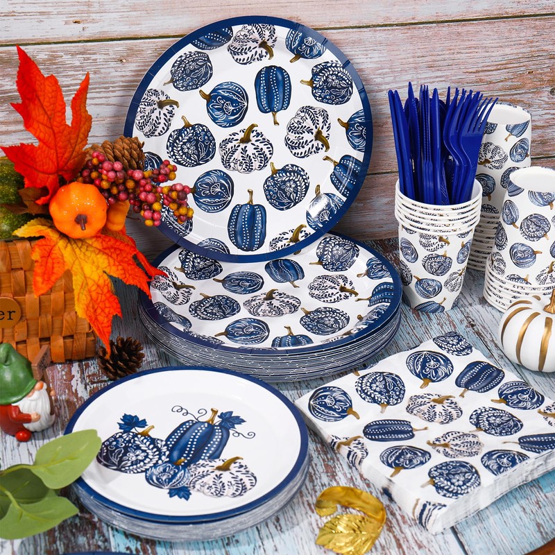 AnyDesign 25 Set Fall Party Supplies Kit Blue Porcelain Pumpkin Floral Tableware Set Autumn Pumpkin Disposable Plates Cups Napkins Forks Knives Spoons for 25 Guests Thanksgiving