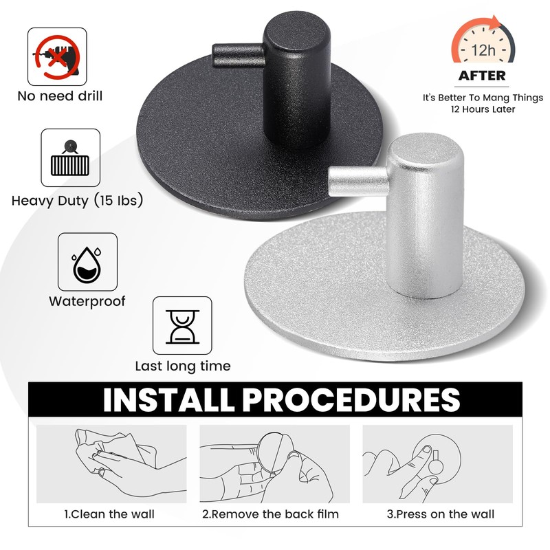 - 【Easy Installation Wall Hooks】: Tear off the self-adhesive film, stick the hook on a smooth surface (such as: metal surface, marble, tile, glass, etc.), wait 24 hours before hanging things.