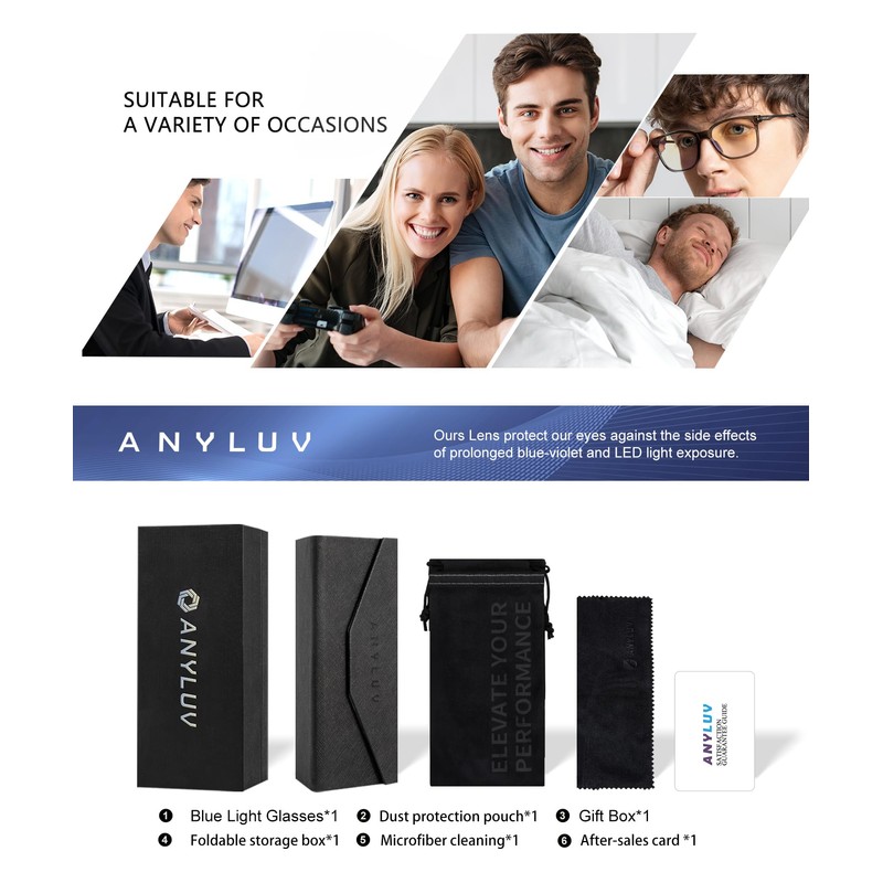 - Eye Protection: With the increasing use of digital devices, protecting your eyes from high-energy blue light is crucial. ANYLUV blue light blocking glasses offer a reliable solution to reduce the risk of discomfort and long-term sight conditions, ensuring your eyes stay healthy and refreshed.