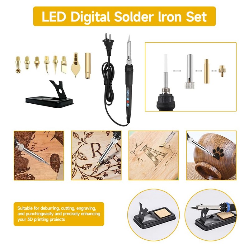• 110V 60W Electric Soldering Iron Kit: Equipped with a digital display and a 47-inch (1.2m) long cord, this soldering iron is designed to finish, smoothing, repair, and modify 3D printed parts.The adjustable temperature range is from 180℃ (356°F) to 500℃ (932°F)