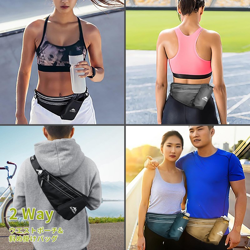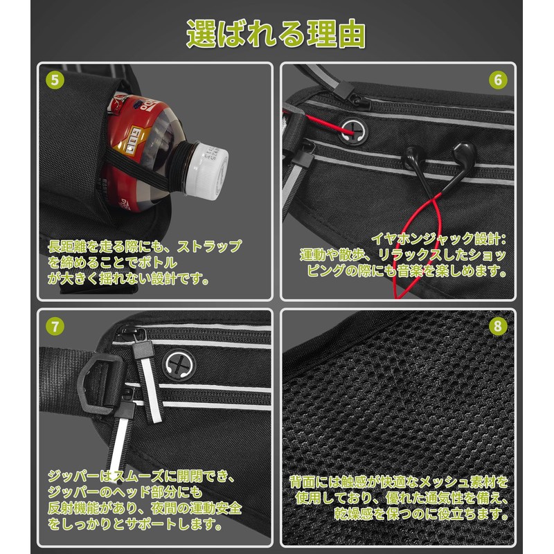 - Thoughtful Pocket: Includes a drink holder that can hold plastic bottles. The holder comes with a strap that can be tightened to the size. Tighten the strap to prevent the bottle from swinging too much when running long distances. ◆Earphone Jack Design: Enjoy music when exercising, walking or relaxing shopping
