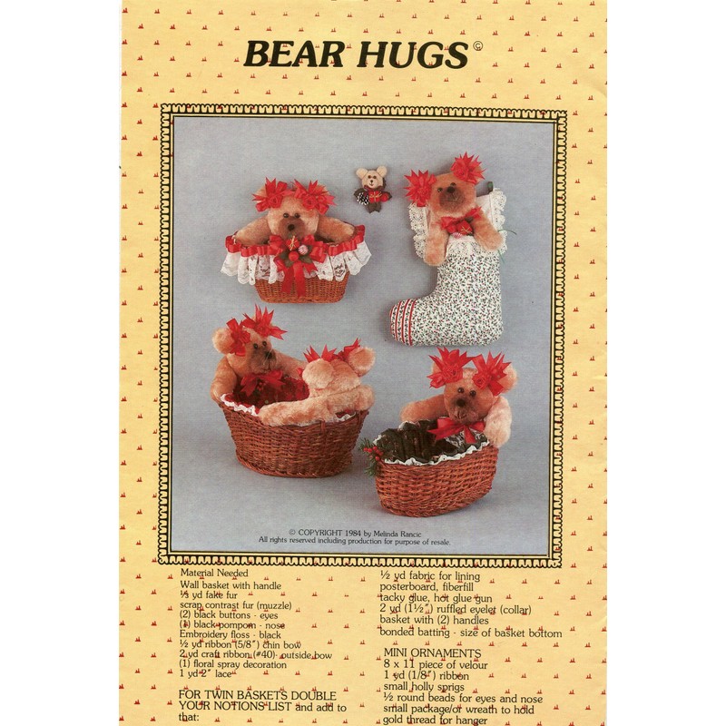 Includes pattern and instructions to sew teddy bears and ornaments, fabric linings for purchased baskets.