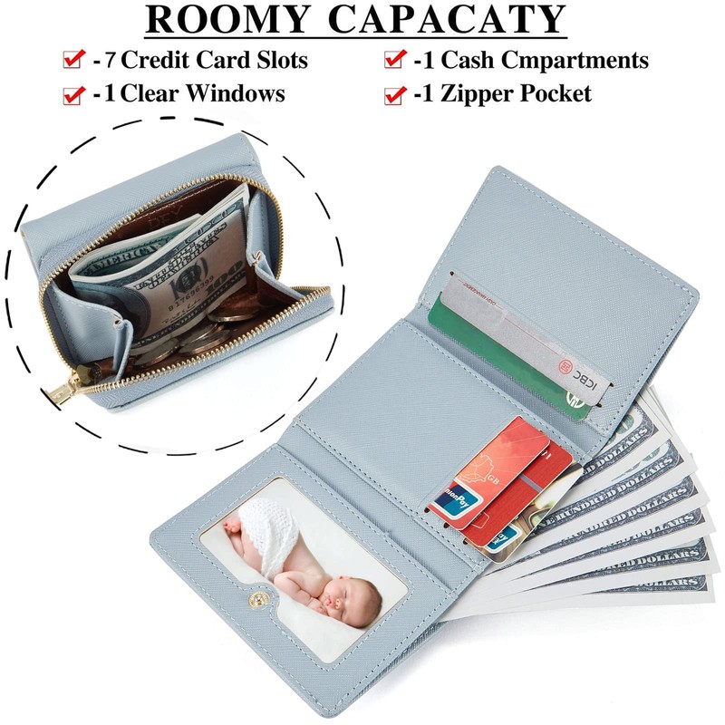- Large capacity wallet: There are 7 card slots, 1 clear photo window, 1 banknote compartment and in particular there is a separate spacious coin compartment with zip. This women's small purse can meet almost all your storage requirements yet saves space.