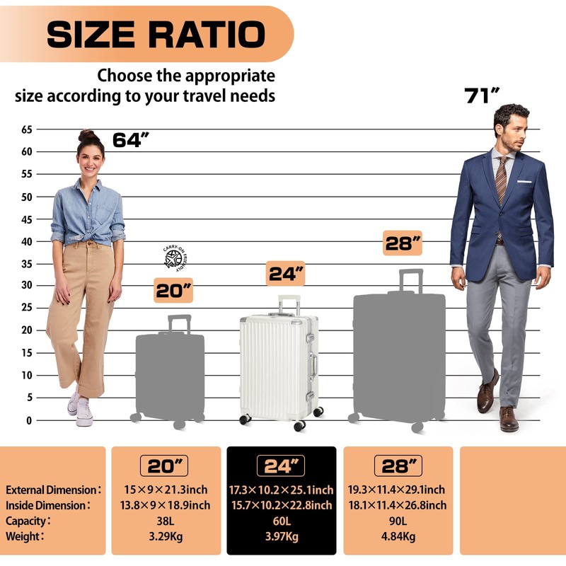 - 【24In Aluminium Luggage】 Size: 17.3*10.2*25.1IN,Weight:3.97kg,Volume: 60L.The vertical design appearance of the luggage surface prevents scratches and keeps the luggage clean and looking like brand new after long hours of use.