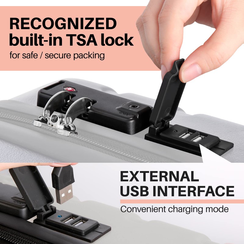 - [USB charging port] There is a built-in USB type charging port, you can put the power bank into the luggage and connect to the built-in interface, so that you can charge at any time without opening the luggage.