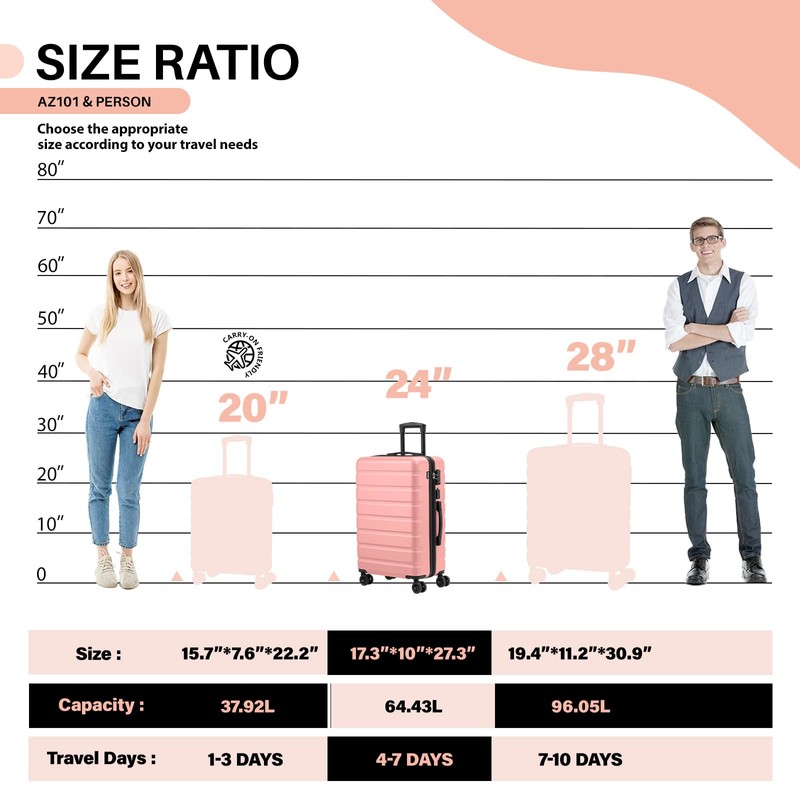 - [Checked-Medium 24 Inch] The 24-inch suitcase meets the functions of boarding, travel, and daily storage. Size:17.3*10*26.3inches.