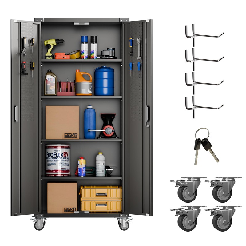 Aobabo Metal Storage Cabinet with Wheels, Steel Lockable Cabinet with Pegboards and 4 Hooks and 4 Shelves, for Home Office Garage, Assembly Required, Black