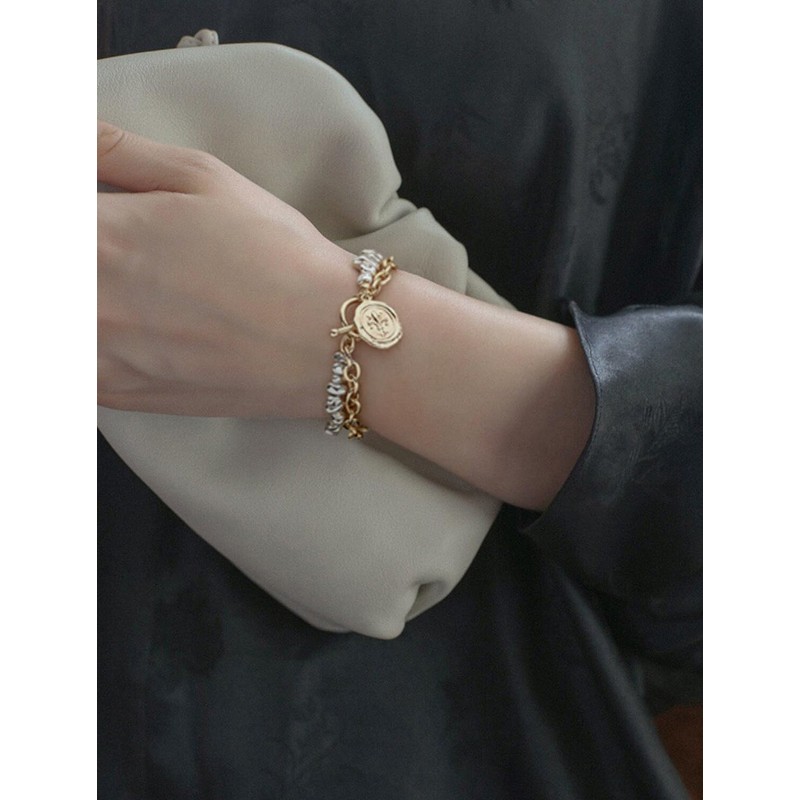 - DESIGN: Our two tone bracelet manages to ride on the trend. The playful contrast between the irregular silhouette of silver beads and the regular rolo link of the gold chain makes the double strand bracelet super modern and individual. While the dangling charm of the coin bracelet adds a bit of connotation. The whole toggle bracelet shows the aesthetic of maximalism.