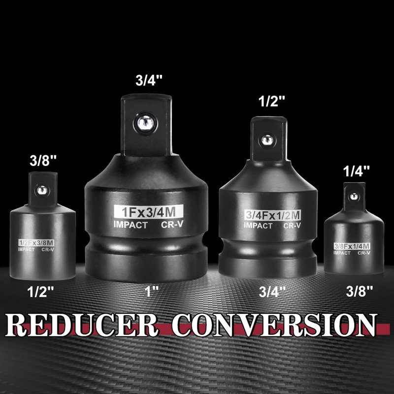 - 【Drive Bit Adapter】: 8 Piece set includes 3/8" to 1/4" reducer, 1/2" to 3/8" reducer, 3/4" to 1/2" reducer, 1" to 3/4" reducer, 1/4" to 3/8" adapter, 3/8" to 1/2" adapter, 1/2" to 3/4" adapter, 3/4" to 1" adapter to give you all the sizes you need to smoothly transition from socket to socket.