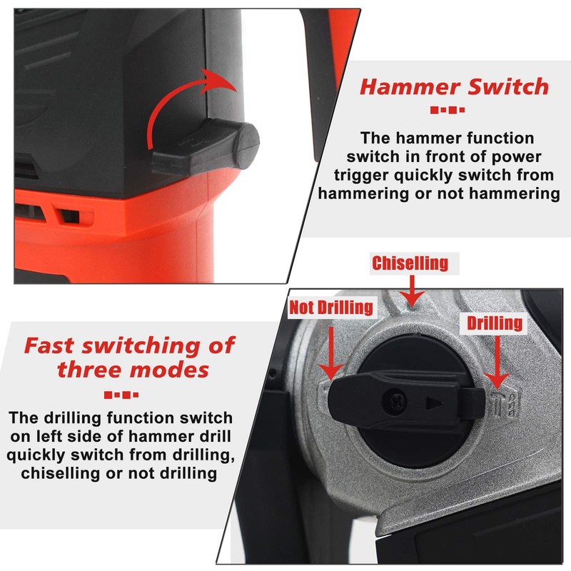 - 【EASY TO OPERAT】 Three function modes can be easily switched - hammer only (chiselling-only), hammer drill (hammering and rotation), and drill only (rotation only) . There are double switch buttons to change the functions which can last longer compare with single switch button.