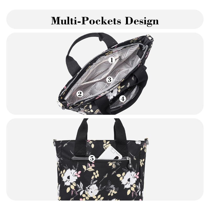 AOCINA Small Tote Bag with Multi Pockets Large Crossbody Bags for Women Nylon Printed Shoulder Bag(Black with Flowers)