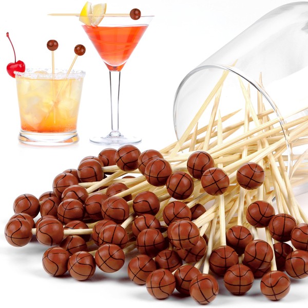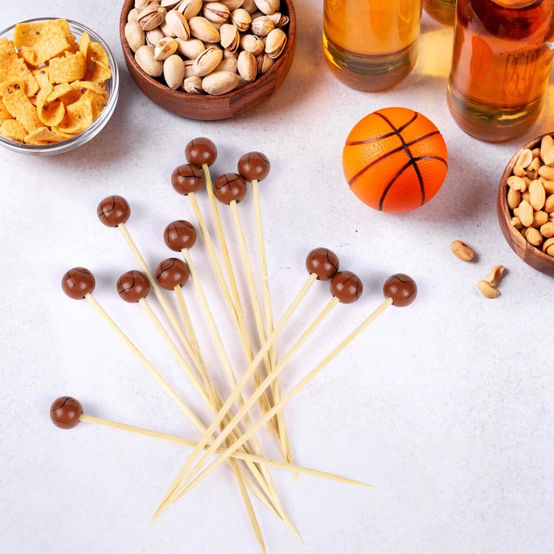 Aodaer 100 Pieces Basketball Bamboo Cocktail Picks 4.7 Inch Decorative Sports Ball End Cocktail Skewers Wooden Decorative Fruit Toothpicks Fruits Sandwich Buffets Party Supplies