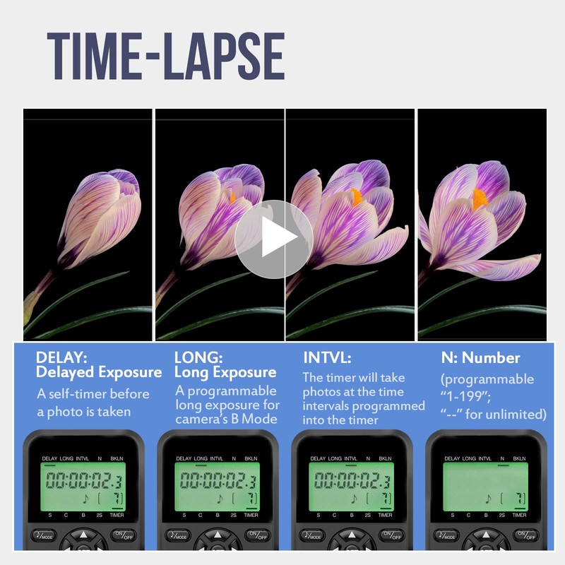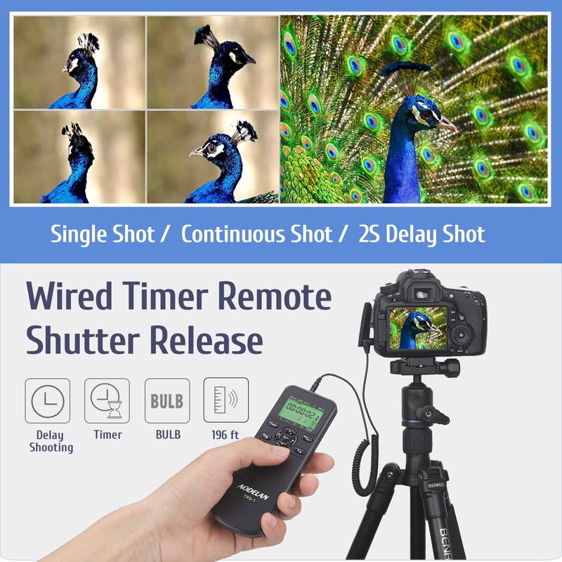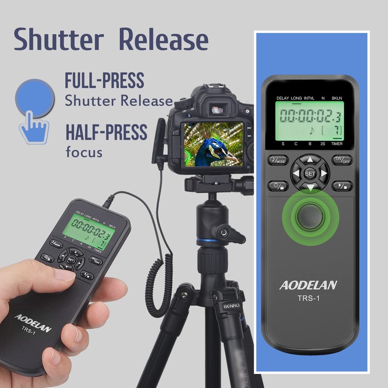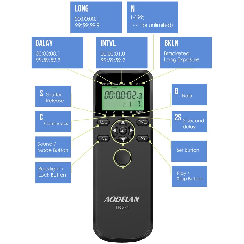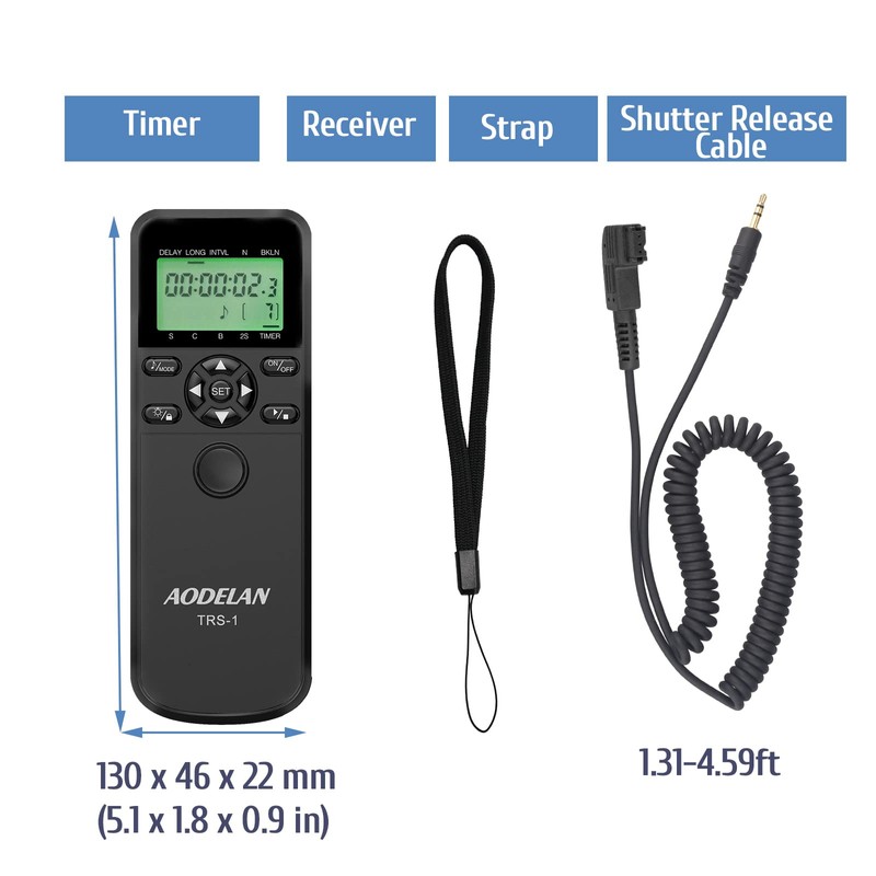 • Timer remote control: you can set the delay time, exposure time, interval time, number of shots, repeat time and repetition times, single shots, continuous shooting, long exposure and 2-second delay modes available