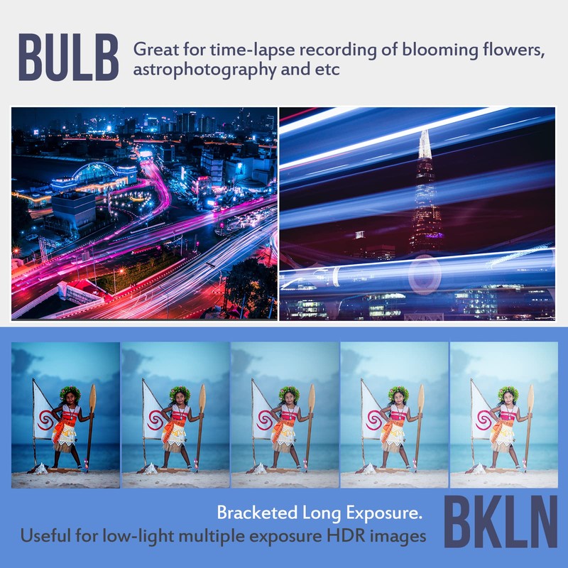 • Timer remote shutter release: When capturing the beautiful moments of sunrise and sunset and flowers bloom and fade, you do not have to wait all the time.