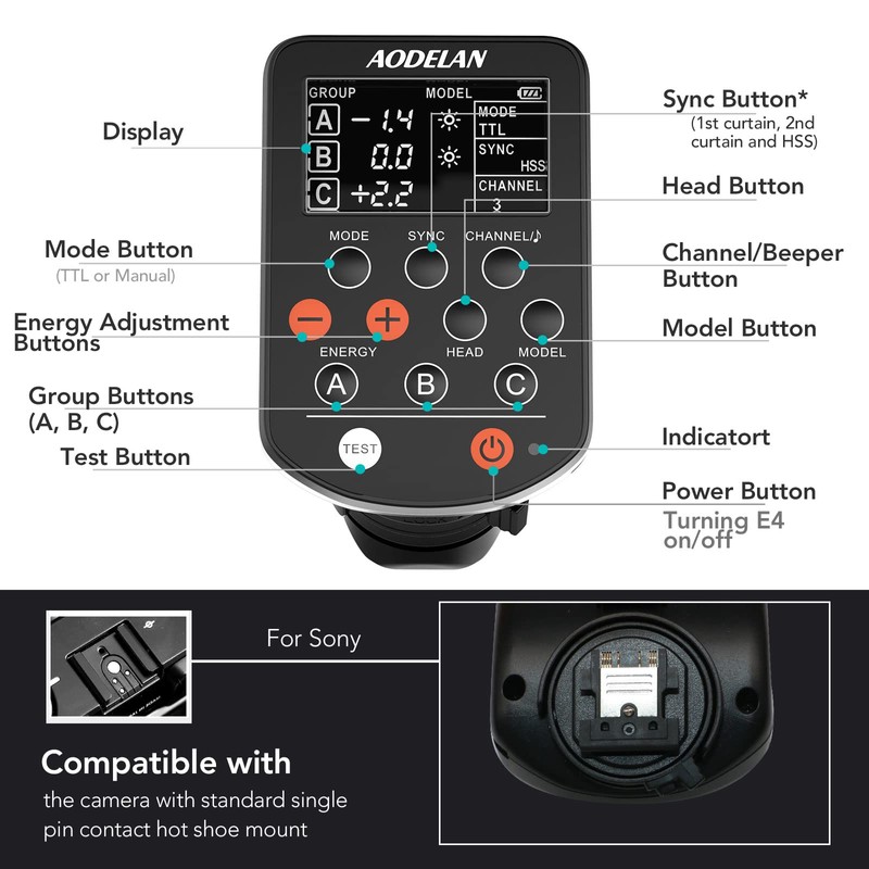 - Well compatible with Profoto system: AODELAN E4 TTL Wireless Flash Trigger fully support TTL communication with Profoto flash lights and the compatible Canon cameras