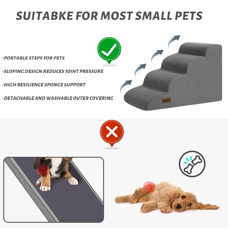 - Safe and stable -This dog ramp is designed with wider steps and a gentle slope to help reduce joint pressure for your pet. It's perfect for puppies, short-legged pets, those with injured feet, or even cats who may have trouble jumping. It provides a safer and more secure experience, ensuring that your furry friend can use it with ease