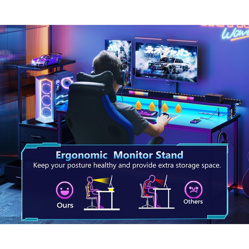 AODK 59 Inch Gaming Desk with USB Charging Ports & LED Light- Reversible Computer Desk with Storage Shelves & Monitor Stand, Modern Gamer Desk Table with Fabric Drawers & Side Hook, Carbon Fiber Black