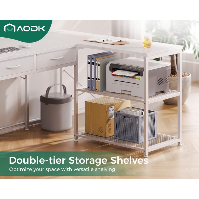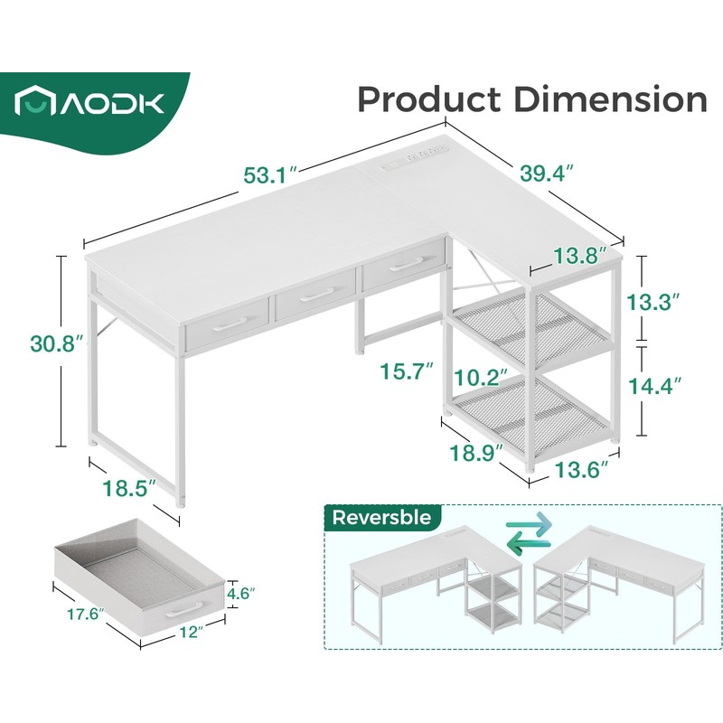 AODK 53 Inch L Shaped Computer Desk with Drawers, Corner Desk with Power Outlets & Reversible Storage Shelves, Movable CPU Stand for Home Office Gaming, White