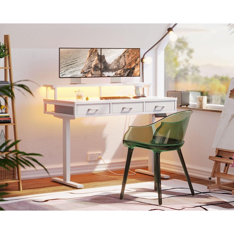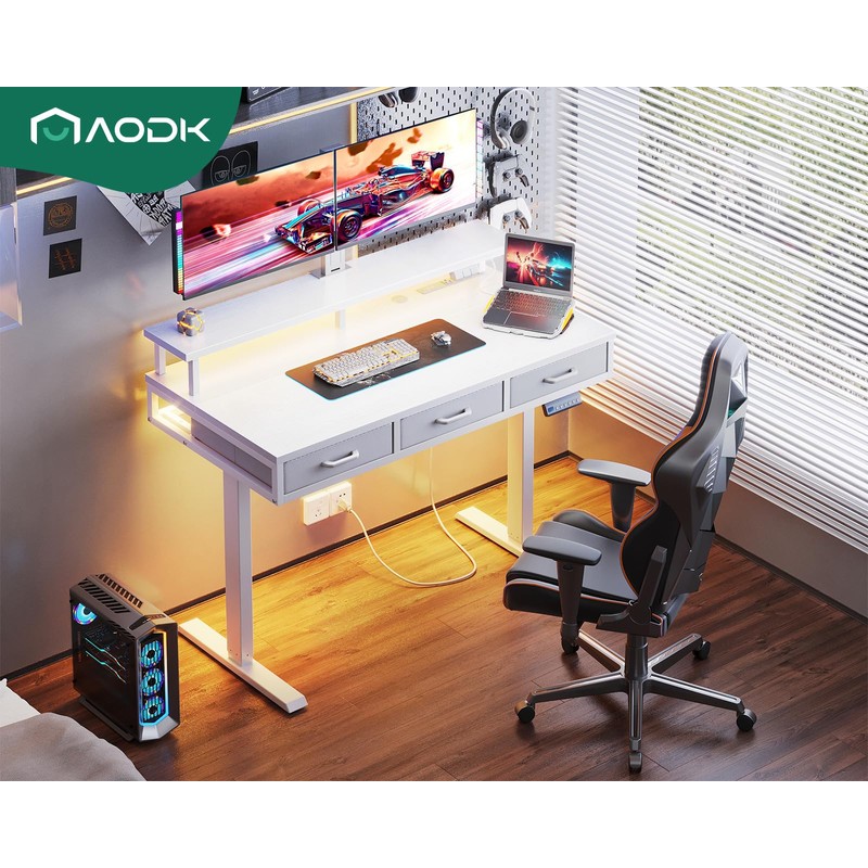 AODK Electric Standing Desk with Drawers, 47 Inch Height Adjustable Small Desk with Power Outlets & LED Lights, Sit Stand Table with Monitor Stand for Home, Office, Workstation, White