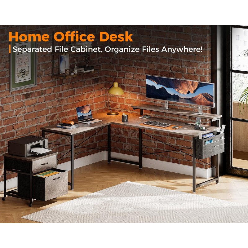 AODK L Shaped Computer Desk, 55" Office Desk with File Cabinet, Power Outlet and Adjustable Monitor Stand, Executive Home Office Furniture Set, Reversible Corner Desk with Storage Bag, Oak Grey