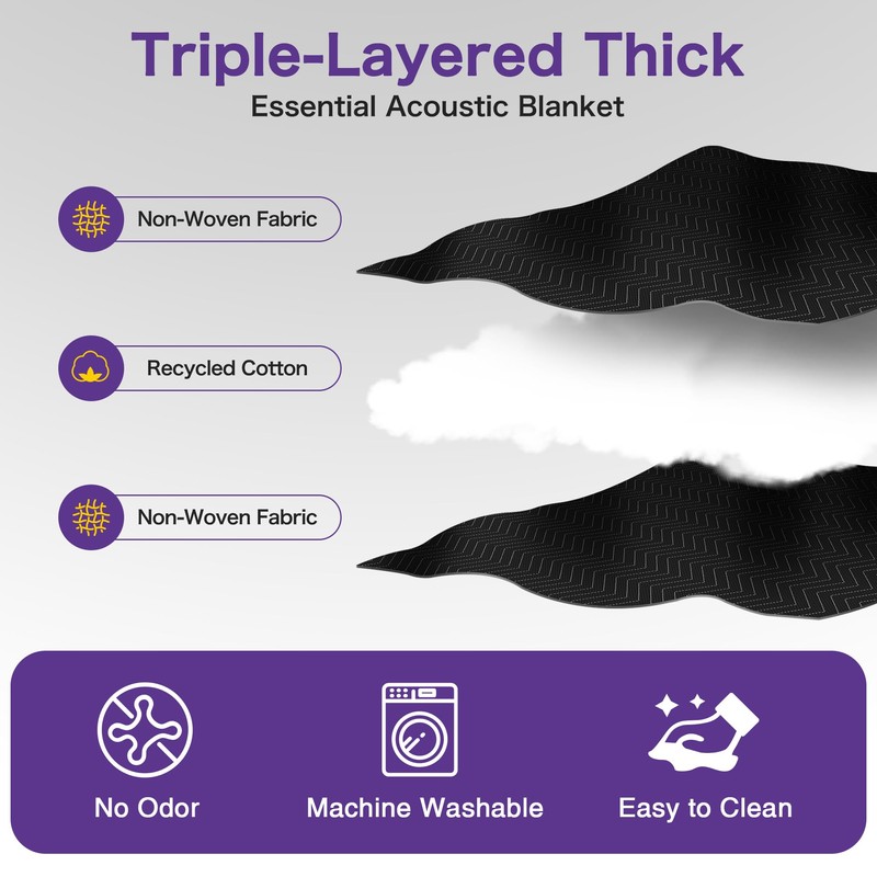 • High Density & Durable: Acoustic blanket crafted from dense non-woven fabric blended with synthetic cotton,boasts a weight of 9.7 pounds,effectively absorbing sound waves and vibrations.Sound blocking blanket incorporates a double lock "Z" stitching technique to firmly anchor the internal padding,while reinforced double stitching along the edges ensures exceptional durability.