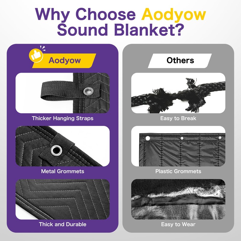 • Versatile Usage:Sound proof blanket for walls is a versatile solution suitable for indoor and outdoor environments.Sound blanket perfect for recording studios,video podcasting,home offices,game rooms,and apartments soundproofing.Aodyow curtain also doubles as blackout curtain,furniture protector,essential camping gear,pet barrier,wind shield,and numerous other applications.