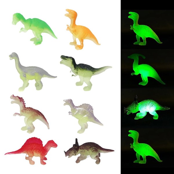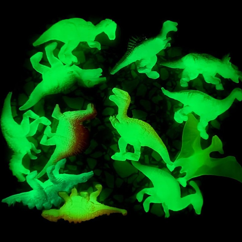 Luminous dinosaur figures: the mini dinosaurs glow in the dark fluorescent green. Expose the figures to direct light before use to enjoy the luminous effect. This ensures great fun and is a real eye-catcher for boys and girls.