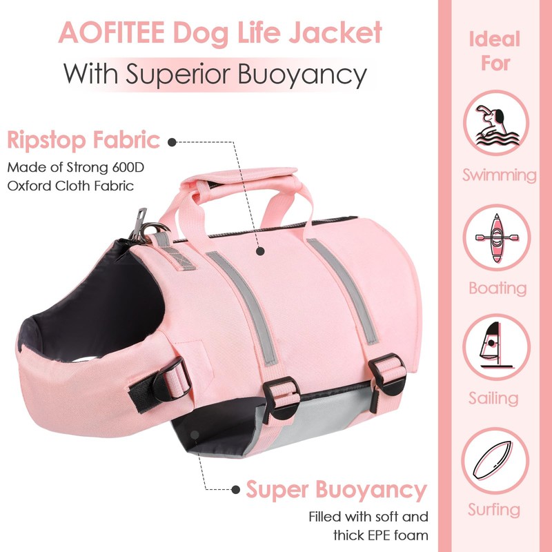 - Superior Buoyancy Dog Life Jacket: AOFITEE life jacket for dogs consist of durable Nylon and Oxford cloth, combined with high-density pearl cotton foam, to create sturdy and durable life jackets. Lightweight and comfortable, tear-resistant and waterproof properties, which are designed to provide excellent buoyancy support for your dog in the water