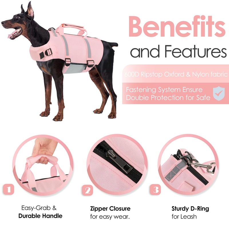 - Top Grab-Handle and Sturdy D-Ring: The large dog life jacket with a sturdy grab handle, not only useful in emergency rescue, but also perfect for grabbing the handle to assist dogs in learning to swim. Additionally, the heavy-duty D-rings for leash is added at the top of the dog swimsuit