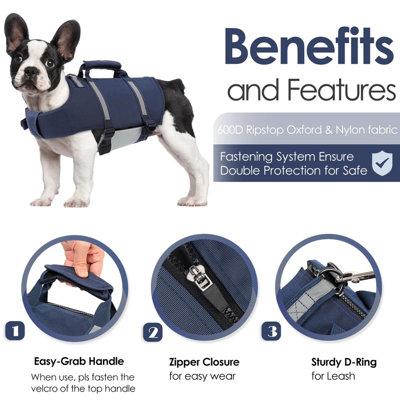 - Top Grab-Handle and Sturdy D-Ring: The small dog life jacket with a sturdy grab handle, not only useful in emergency rescue, but also perfect for grabbing the handle to assist dogs in learning to swim. Additionally, the heavy-duty D-rings for leash is added at the top of the dog swimsuit