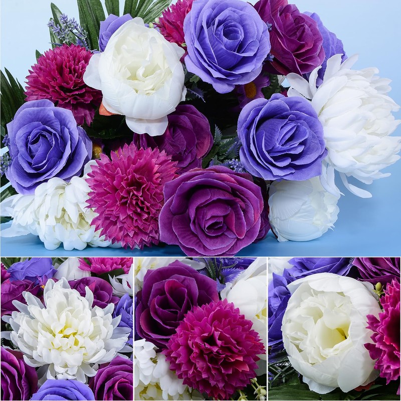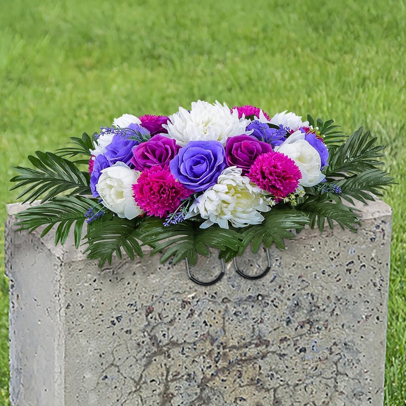 - Three-piece headstone flowers set includes: 1 saddle and 2 bouquets with vases. The cemetery flowers saddle has 12 pieces of green leaves, 6 purple roses, 4 dark purple roses, 6 rose chrysanthemums, 3 white peonies, 3 white chrysanthemums. Each grave flowers bouquet has green leaves, 4 white chrysanthemums, 3 white peonies, 6 purple roses, 5 dark purple roses, 6 rose chrysanthemums. The headstone flowers are very full and elegant for the outdoor cemetery decorations.