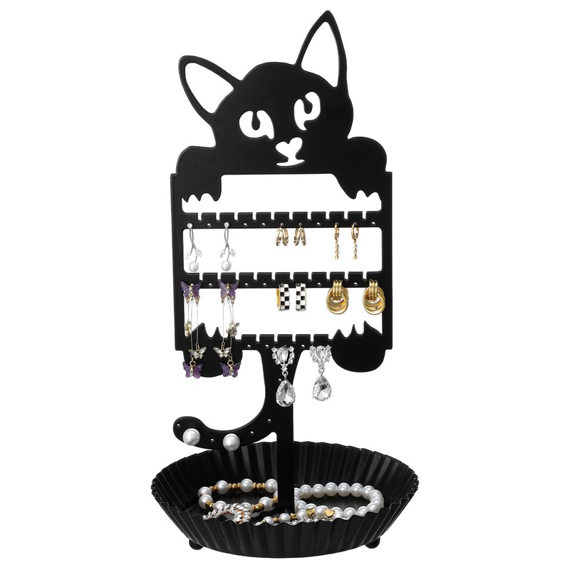 - Multi-Functional Earring Holder Stand Hanging Organizer: Use the cat's tail to display necklaces, bracelets, and rings. The included metal tray (7.2" diameter) stores rings or small accessories, while the scratch-proof base protects furniture surfaces.