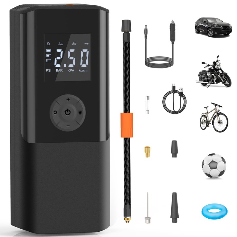 - ⚽️【Multifunctional】The versatile air pump is lightweight and portable, easy to store. The kit includes an air hose, a ball needle, a valve adapter, a swimming buoy nozzle, a type-C charging cable, and a cigarette lighter connection cable, suitable for inflating cars, motorcycles, balls, swim rings, etc.