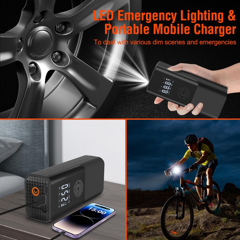 - 🔧【Emergency Use】The top of the wireless air pump is equipped with an emergency LED light, which can be used in case of dark nights on the road. The built-in 3*2000mAh battery can also be used to charge your phone in case of emergencies. (Charging function is recommended for emergency use only.)