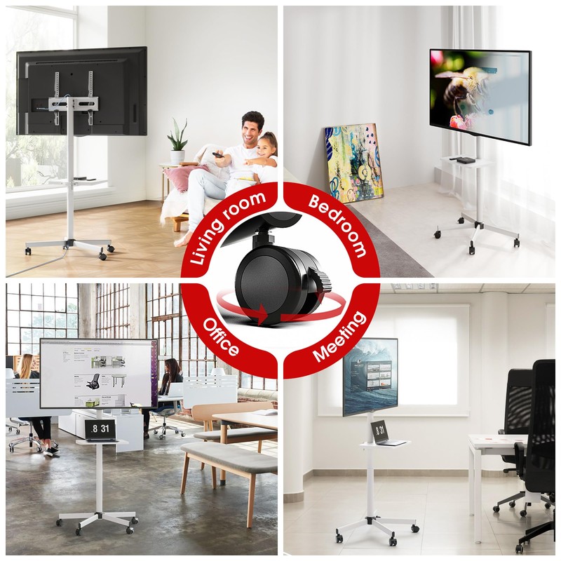 - Space-Saving TV Stand on Wheels: The innovative long-front, short-back base design enhances stability, prevents tipping, and keeps the TV cart close to the wall. Move your portable TV stand effortlessly with quiet, smooth-rolling wheels that work on both hardwood floors and carpets