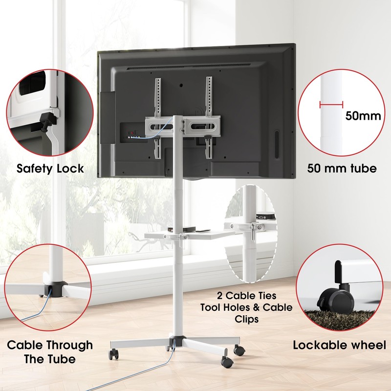 - Mobile TV Stand with Cable Management: Keep your space tidy with cable management options of this rolling TV stand. Thread cables through the tubes for a clean look or store them at the back of the TV stand on wheels to avoid tripping