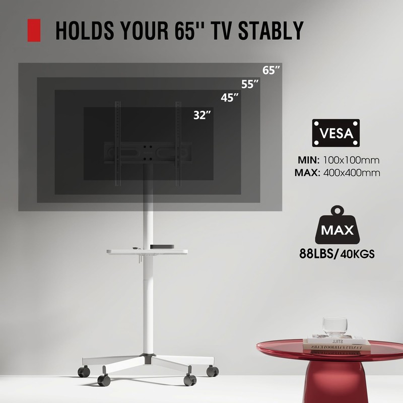 - Ultra-Strong Portable TV Stand: This rolling TV stand fits 32" to 65" LCD/LED/OLED flat or curved screens with VESA 100x100mm-400x400mm. Built with high-strength alloy steel, the TV rolling stand supports up to 88 lbs, ensuring stability and safety. The safety lock design keeps your TV secure, making this TV cart a reliable choice for any room