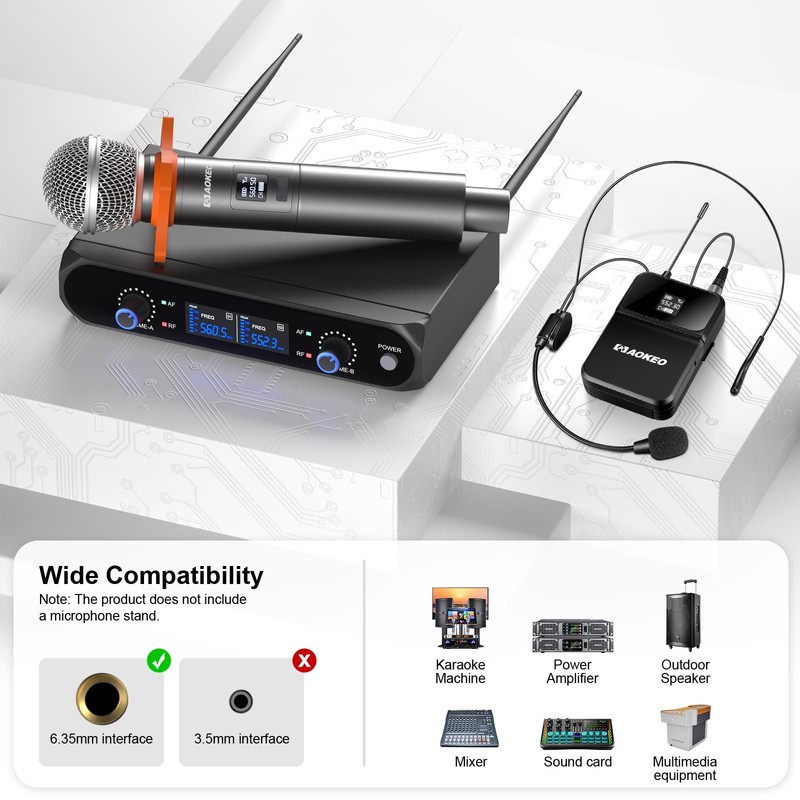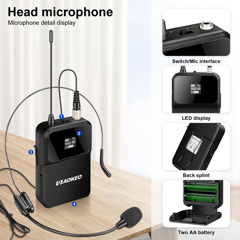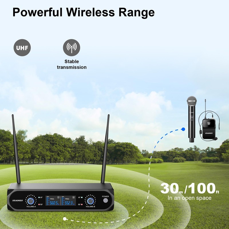 - đ€Stable signal, wide range: The outdoor wireless range can reach 100 feet. High quality quartz oscillator ensures accurate frequency adjustment, stable signal transmission, uninterrupted, and anti-interference. The package includes 1* handheld microphone,1* beltpack + headset microphone,very suitable for indoor and outdoor activities such as family karaoke, church, gatherings, weddings, conferences or lectures.