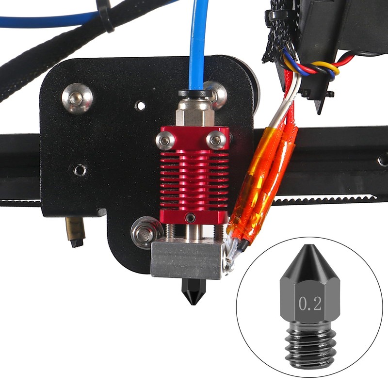 • Nozzles: made of hardened steel, sturdy, long-life use time, high-temperature and wear resistance, smooth silk, connect with M6 out thread, easy to use, and suitable for 3D printing at high temperatures, and the highest temperature of up to 450℃. Filament Diameter: 1.75mm, Output Diameter: 0.2mm