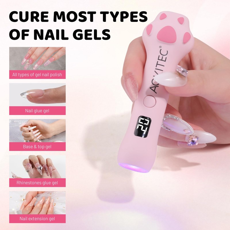 - 【Tragbare UV LED Nagellampe in Katzenpfotenform】Die Mini UV Lampe Nägel von Aokitec in Katzenpfotenform vereint Mode und Leistung. Sie verwendet fortschrittliche 365 nm + 405 nm Dual-Wellenlängen-LED-Lampenperlen und einen 8-fach konvexen Linsenstrahler, der für schnelles Trocknen der Nägel sorgt.