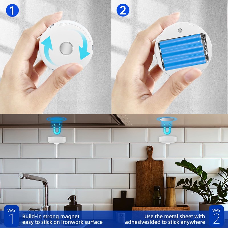 • Easy to Install: The puck lights are powered by 3 AAA batteries (NOT INCLUDED). Push lights come with magnetism, allowing you to easily attach it to any iron surface. There also have a sticker mounting disk, you can install them at any where you want. No drills, No Screws and No Ugly Holes in the Furniture