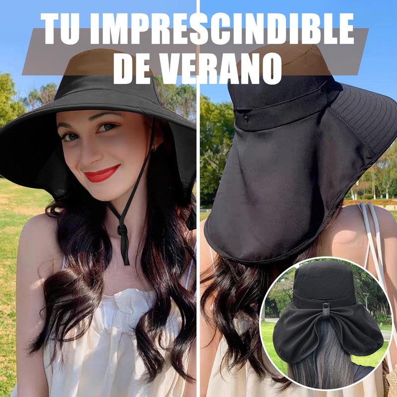 - 【Abertura trasera para el cabello】La exclusiva abertura trasera para el cabello facilita el peinado con coletas o moños, manteniendo el cabello fresco y sin apelmazamiento. La cuerda ajustable para el viento asegura la estabilidad del sombrero incluso con viento fuerte. El diseño plegable y extensible de tela para el cuello protege la piel del cuello, que suele pasar desapercibida.