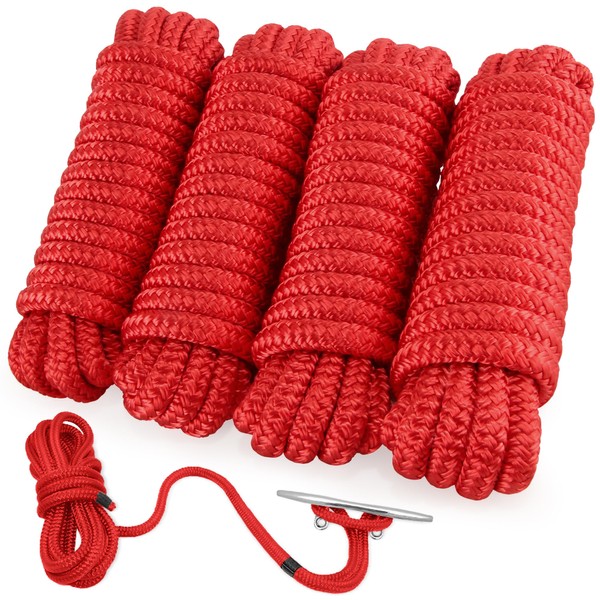 AOLEBA Boat Dock Lines 3/8''x 15'Dock Line Double Braided Nylon Boat Dock Lines & Rope Dock Lines for Boats Boat Ropes for Docking with Loop Boat Mooring Lines Set 4 Piece-Red