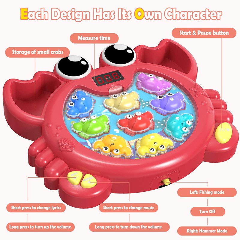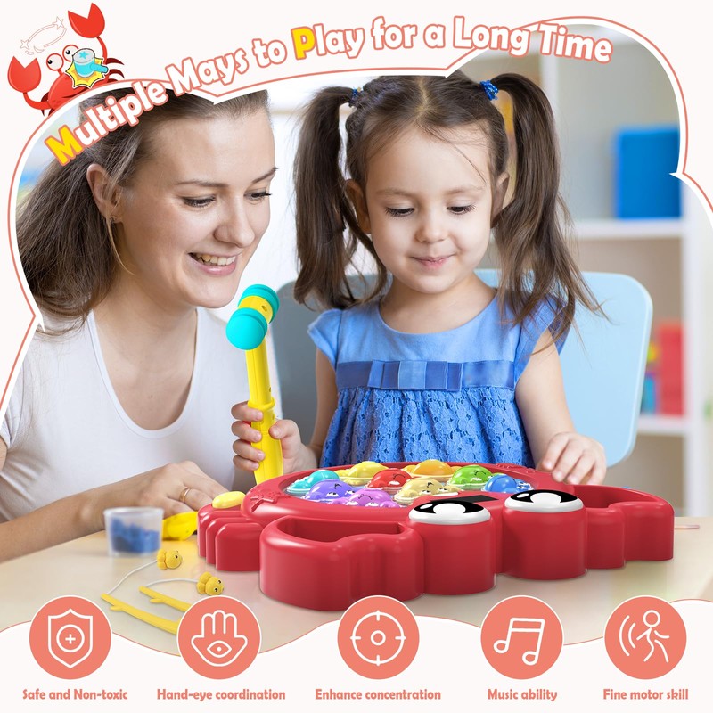• Interactive Whack-A-Mole Fun: This toddler toy brings the classic Whack-A-Mole game to life, featuring a crab design. Kids aged 3-6 can use the hammer to whack the crabs as they light up, promoting hand-eye coordination and fine motor skills development.